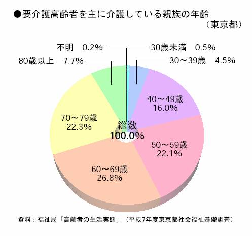 在宅で主に介護にあたる親族を年齢別にみると、平成7 年度の調査では60歳以上が56.8%を占めている。平成2年度の調査では52.4%であり、介護者の高齢化が進んでいる。